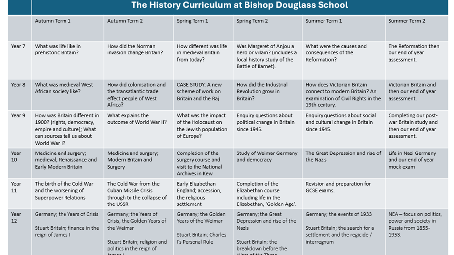 Our history curriculum is designed to provide students with knowledge of the many histories that inform the lives of people in Britain today. The curriculum is designed to appeal to all students at Bishop Douglass School by investigating the histories of different social groups so that students can understand the history of many people in the British Isles. As part of this, students will be expected to understand conflicting historical arguments, critically analyse evidence and use this to inform their own judgement on historical topics. Running through this is an emphasis on literacy and numeracy. Essay writing and extensive reading are central to the history curriculum and are incorporated into our schemes of work. A history library and reading list is also available to students to support their literacy development access to academic texts. Opportunities for numeracy are built into lessons or incorporated into marking and day-to-day teaching.